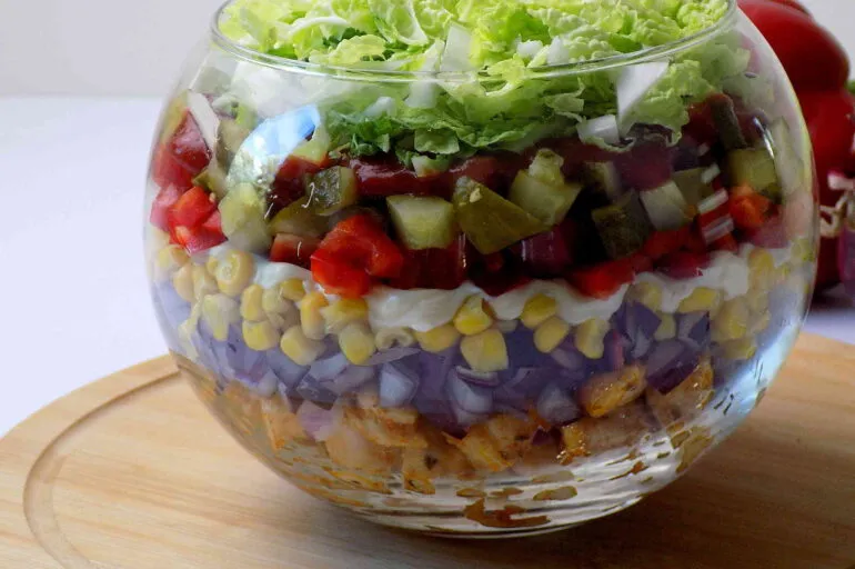 - Estetyczne ułożenie warstw sałatki oraz odpowiednie serwowanie podkreślają jej walory smakowe i wizualne.